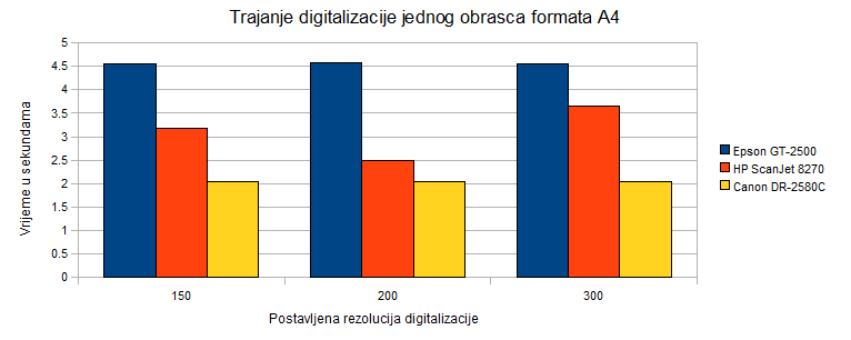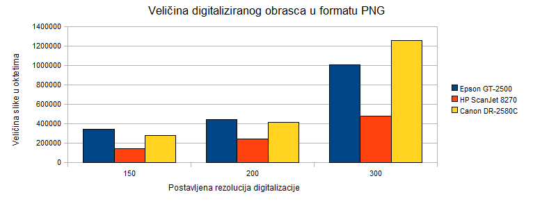 U svrhu mjerenja uzeto je 50 pripremljenih obrazaca formata A4, koji su potom digitalizirani na različitim rezolucijama. Očitavanje je uvijek išlo u 256 nijansi sive boje, bez dodatnih obrada od strane proizvođačevog pogonskog programa (korišteno je sučelje TWAIN, sa svim opcijama isključenima).